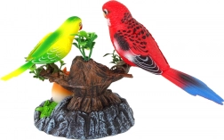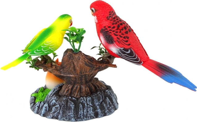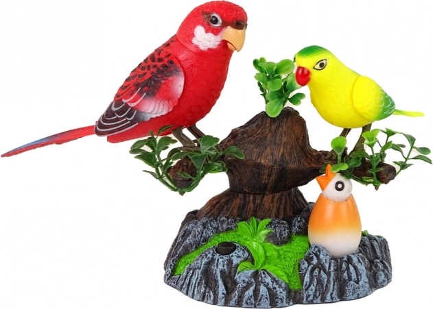 Dans la boîte, vous trouverez deux perroquets – un rouge et un jaune – perchés sur une branche d’arbre, ainsi qu’un petit oisillon dans une coquille. Les oiseaux sur les branches émettent différents sons et se déplacent, vous donnant l’impression d’être en pleine nature, tandis que le petit oiseau s’illumine de couleurs vives. Il suffit d’appuyer sur le bouton noir pour activer le jouet.
