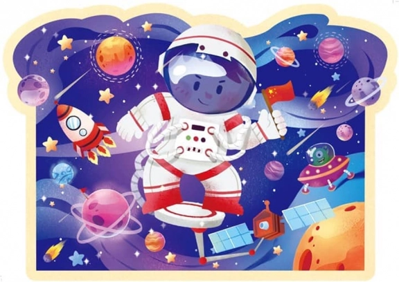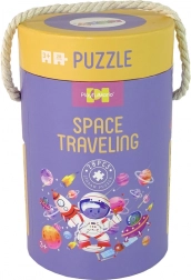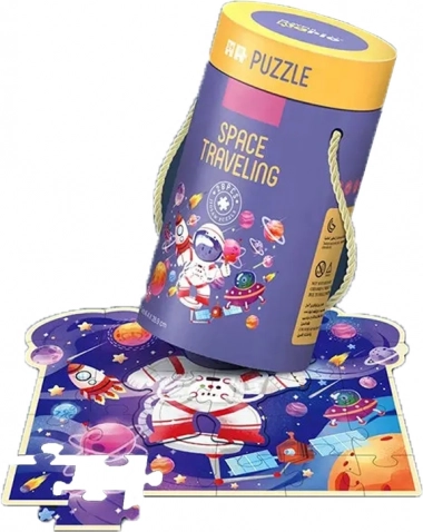 Les illustrations présentent un petit astronaute dans un univers rempli de planètes, de fusées et de satellites, plongeant l’enfant dans une aventure spatiale colorée et détaillée. L’emballage en tube rond et pratique permet un transport et un rangement faciles, idéal à la maison comme en voyage.