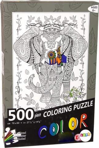 Plongez dans un monde de création avec 500 pièces de puzzle en noir et blanc et 6 feutres pour les colorier. Assemblez l’image d’un éléphant entouré de feuilles et exposez-la fièrement comme décoration murale ou comme set de table.
