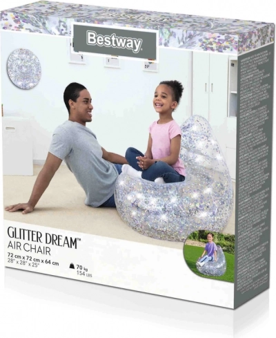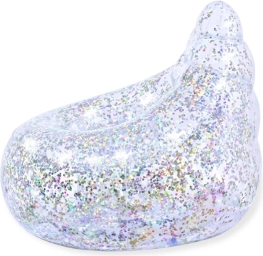 Le fauteuil gonflable se vante d'un plastique transparent plein de paillettes colorées qui scintillent à chaque mouvement, apportant une touche d'éclat à votre espace.