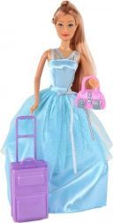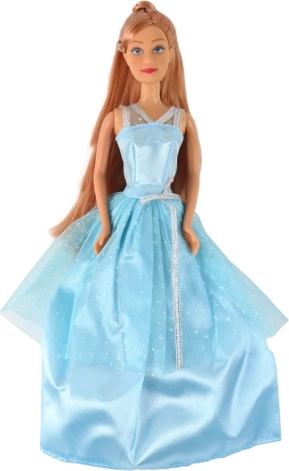 La poupée porte une longue robe bleue scintillante avec un surjupon en tulle et de délicats accents argentés. Idéale pour des aventures royales.
