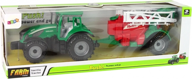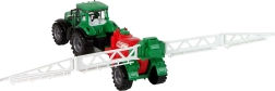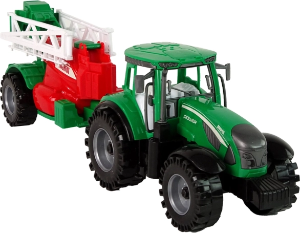 Le pulvérisateur rouge‑vert aux longs bras blancs se fixe facilement derrière le tracteur et permet de simuler le travail aux champs.