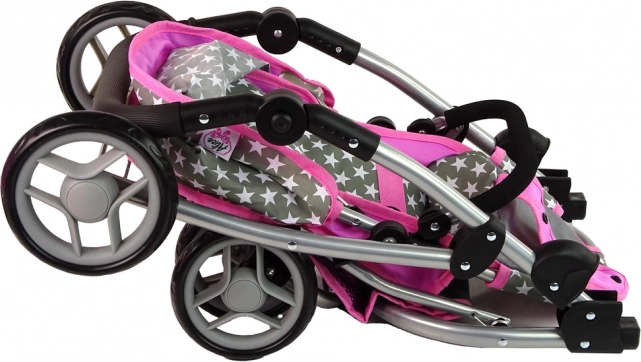 La poussette combine les couleurs rose et gris avec un motif étoilé, offrant un look réaliste pour jouer aux parents.