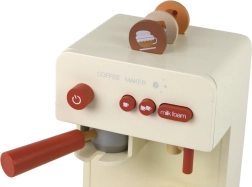 Élégante cafetière en bois pour enfants avec boutons réalistes, choix entre café simple ou double et « interrupteur » pour faire mousser le lait. Inclus une tasse, un porte-filtre et 6 capsules pour un jeu créatif de barista. Conception sûre avec certifications CE et conformité EN71, idéale pour les enfants à partir de 3 ans.