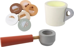 Comprend une tasse, un porte-filtre et 6 capsules illustrées de boissons. Les enfants composent facilement leur propre « carte des boissons » et s’exercent au service des invités ainsi qu’à la motricité fine.