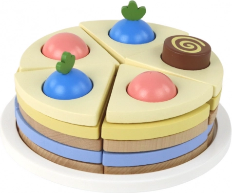 Ce gâteau en bois de qualité est divisé en segments reliés par Velcro. Les enfants peuvent ainsi facilement « couper », assembler et servir des parts, entraîner leur prise en main et stimuler leur imagination. Les décorations colorées et les éléments invitent à l’exploration, à l’apprentissage des couleurs et des formes.