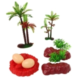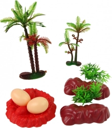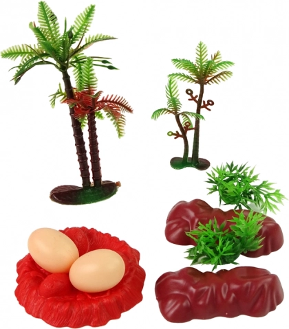 Les accessoires comprennent deux rochers, deux buissons, deux arbres et deux œufs de dinosaure avec un socle, complétant des scénarios authentiques et augmentant le potentiel créatif du jeu. De plus, ce set est fabriqué en plastique durable, garantissant une longue durée de vie et une résistance aux aventures des enfants.