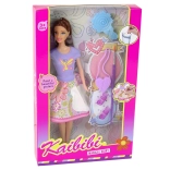 La boîte contient tout le nécessaire pour jouer et coiffer : escarpins roses assortis à la tenue, sac violet en forme de cœur et petit peigne bleu pour créer des coiffures. La poupée est en plastique résistant, facile à tenir et à emporter.
