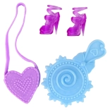 Le set comprend des talons roses, un sac en forme de cœur et un accessoire rond bleu – tout assorti à la tenue de la poupée pour multiplier les possibilités de jeu.