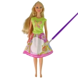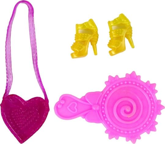 Le set contient tout le nécessaire pour jouer immédiatement : un pinceau pour décorer la robe, des chaussures dorées assorties au style, un peigne rose pour coiffer et un sac rose en forme de cœur comme accessoire charmant. La poupée est légère, résistante et facile à emporter.