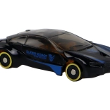 En mode voiture, le robot devient un véhicule futuriste avec des jantes jaunes et des détails bleus qui attirent le regard.