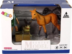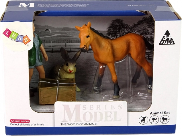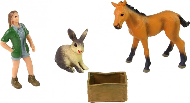 Set de figurines avec un cheval clair, un lapin et un vétérinaire pour un jeu créatif. Rendu réaliste, caoutchouc dur et matériaux non toxiques pour un amusement sûr dès 3 ans.