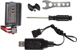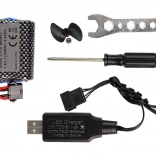 Contenu de l’emballage : bateau, radiocommande 2,4 GHz, pare-chocs anti-collision, batterie, câble de charge USB, hélice de rechange, clé, tournevis, support et manuel.
