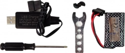 L’ensemble comprend également des accessoires tels qu’un câble pour la batterie, une clé, un tournevis, un support de bateau à moteur pour le stabiliser à terre, et une hélice.