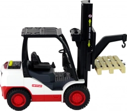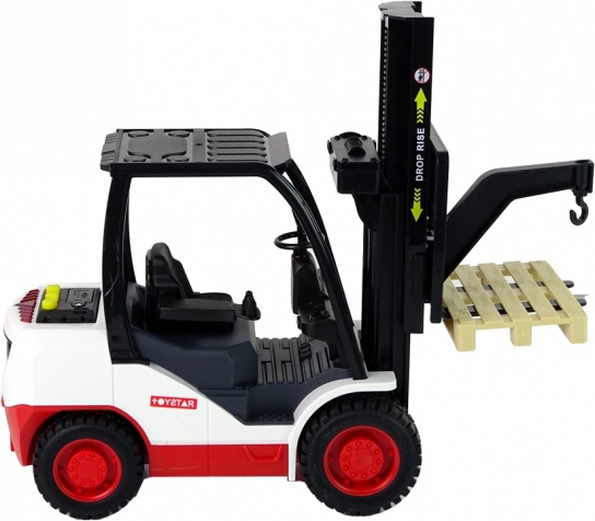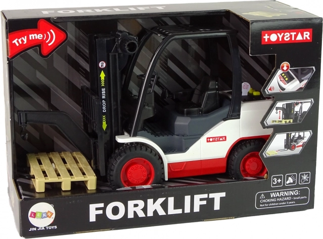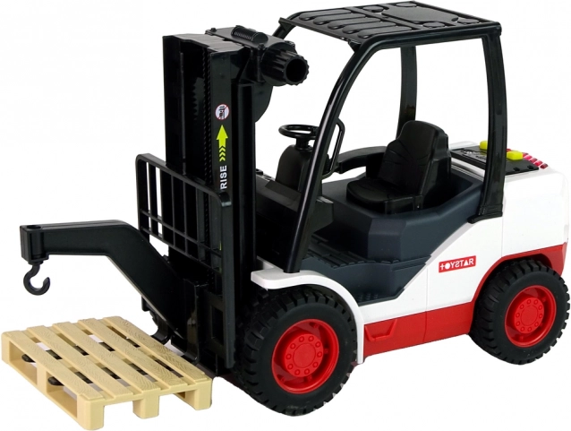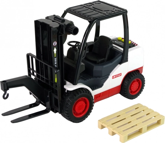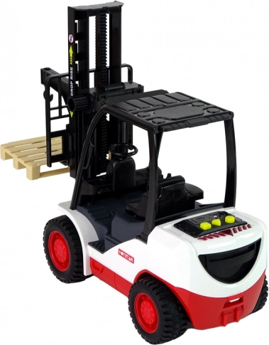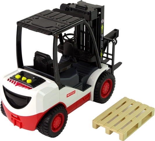 Ce chariot élévateur riche en détails ravira tous les petits fans d’engins de chantier. Grâce à la molette rotative, les fourches se lèvent et s’abaissent facilement, tandis que trois sons réalistes et une lumière rouge s’activent en appuyant sur les boutons jaunes pour intensifier l’expérience de jeu. Il comprend une palette amovible pour le chargement et le déchargement.