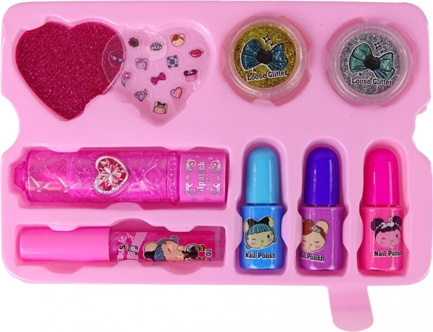 Trois vernis à ongles en bleu, violet et rose vous permettent d’expérimenter diverses teintes et de créer des manucures tendance. Un rouge à lèvres rose et un gloss rose en tube apportent une jolie touche aux lèvres.