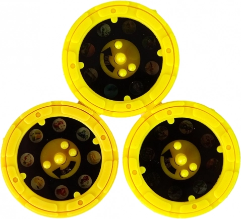 Trois disques interchangeables de 8 vues proposent les thèmes insectes, dinosaures et fruits. Mise en place facile et changement fluide des motifs.