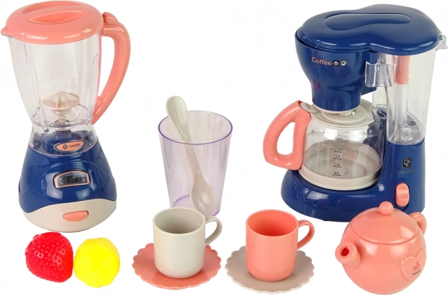 - Cafetière (16 cm), mixeur (16 cm), 2 tasses, 2 sous-tasses, verre, cuillère, fraise, citron, théière