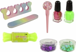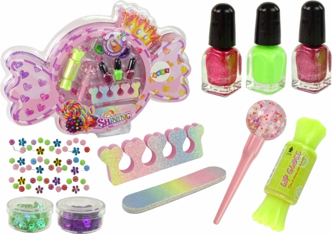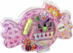 Enchantant coffret de décoration des ongles et de maquillage, présenté dans un emballage exceptionnel en forme de bonbon. Idéal comme cadeau pour les petites amatrices de maquillage, de cosmétique et de loisirs créatifs.