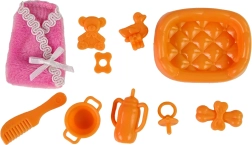 Le set comprend également une petite poupée – une fillette aux cheveux blonds et aux yeux bleus. L’ensemble est complété par de nombreux accessoires, tels qu’un peigne, une tasse, une tétine, un canard de bain, un biberon, un ours en peluche et une chaise haute. Un cadeau idéal pour stimuler la créativité des enfants et le développement de leurs compétences de soin.