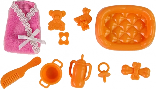 Le set comprend divers accessoires comme un peigne, un canard de bain et un biberon, qui enrichissent les possibilités de jeu.