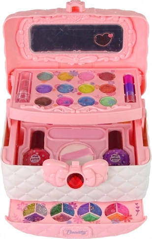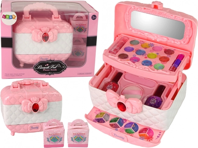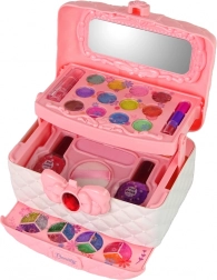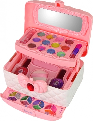 Cette mallette élégante avec nœud renferme tout le nécessaire pour un maquillage enfant sécurisé et un jeu créatif de salon de beauté. Grâce aux trois tiroirs bien agencés, les enfants ont tous les accessoires sous la main, et le miroir dans le couvercle aide pour la touche finale. Dimensions compactes 16 × 18 × 10 cm pour un transport facile lors des visites comme en vacances.