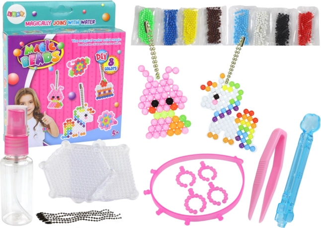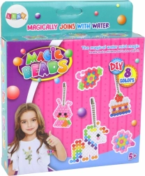 Les perles aquatiques sont de petites billes colorées qui, après une pulvérisation d’eau, s’assemblent en un seul ensemble – sans colle ni fer à repasser. Les enfants peuvent créer une infinité de formes, de personnages et de décorations puis les transformer en pendentifs ou en ornements pour la chambre.