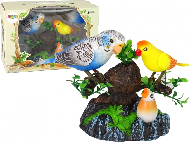 L’ensemble comprend deux perroquets — un bleu et un jaune — posés sur une branche d’arbre, ainsi qu’un petit oisillon dans une coquille posé en dessous.