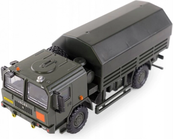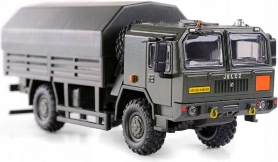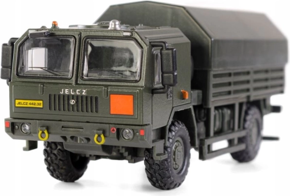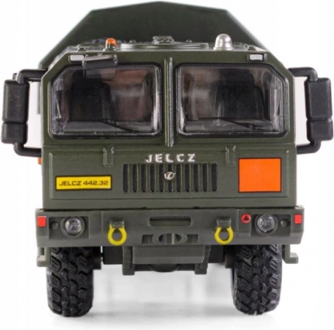 Ce modèle de précision représente le camion plateau militaire JELCZ 442.32 avec cabine biplace basculante hydraulique et carrosserie plateau/fourgon destinée au transport de vrac, de palettes et d’un conteneur ISO 15'. Le véhicule réel est un spécial développé pour les besoins de l’armée, ce qui se reflète dans le grand nombre de détails fonctionnels du modèle.