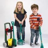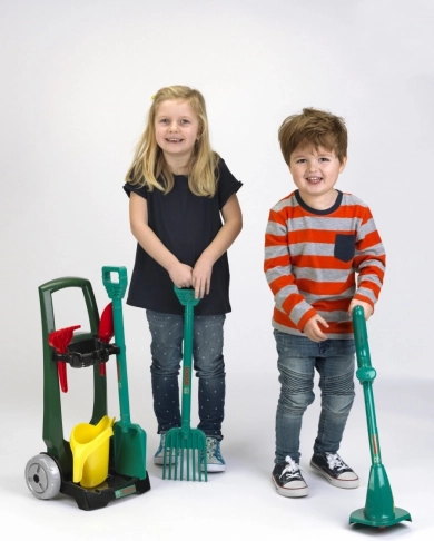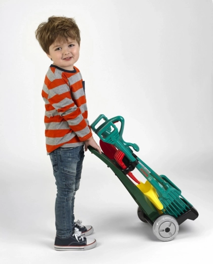 Un ensemble indestructible pour les petits passionnés d’activités en plein air et de jardinage. Le chariot de jardin est fabriqué en plastique de haute qualité, de couleur vert foncé, doté de deux grandes roues mobiles. Il est en outre équipé d’un panier noir pour les petits accessoires de jardin et d’une base noire stable, sur laquelle vous pouvez transporter les outils de jardin à l’aide d’une poignée confortable. Le chariot de jardin est une réplique du design populaire de la marque Bosch. Les accessoires du chariot comprennent une pelle et un râteau robustes de couleur verte en plastique de qualité, ainsi qu’un arrosoir jaune, une petite pelle de jardin rouge et un râteau à sable. Particulièrement apprécié: le coupe-bordures vert, qui émet un super bruit de cliquetis lorsque la roue tourne. Participer au jardinage n’est pas seulement un amusement pour les enfants, cela entraîne aussi la motricité, la pensée spatiale et constitue un exercice sain à l’air frais.