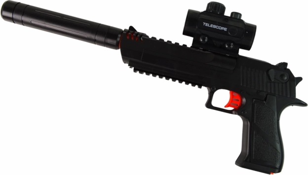 Les deux modèles disposent de viseurs télescopiques permettant un tir précis. Le fusil est équipé d’un laser facilitant un ciblage exact, tandis que le pistolet est doté d’un silencieux pour un tir plus discret.