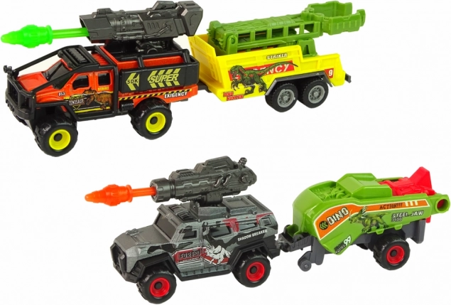 Cet ensemble comprend deux voitures-jouets avec remorques pour transporter les dinosaures. Chaque véhicule est équipé d'un lanceur pivotant, ajoutant une dimension d'action au jeu. Le design détaillé de ces véhicules rend le jeu encore plus intéressant.