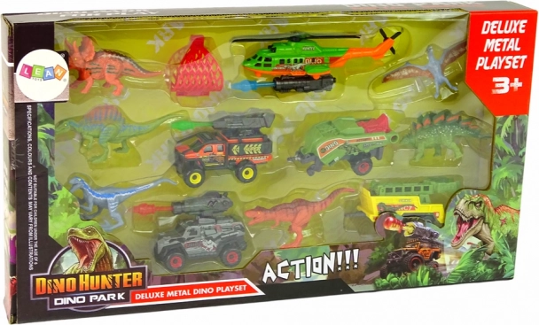 Le coffret de jeu 'Dino Hunter' Deluxe Metal comprend divers dinosaures en plastique, des véhicules et un hélicoptère. Il offre aux enfants un jeu d'imagination plein d'action et d'aventure.