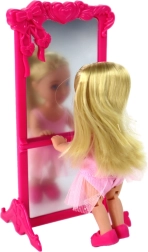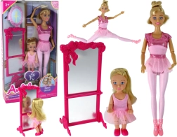 Une élégante maman ballerine en costume rose avec des éléments scintillants et une jupe en tulle enseigne à sa petite danseuse ses premières pirouettes. Les deux poupées portent des chaussons de ballet roses et ont de longs cheveux blonds coiffés pour le cours de danse. Le grand miroir rose décoré crée une scène féerique pour l’entraînement quotidien comme pour les grandes représentations.