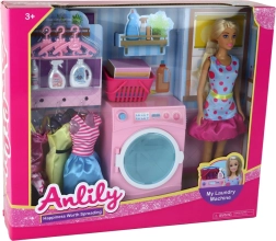 - Poupée ANLILY, machine à laver, panier à linge, 3 cintres, 3 robes, 3 flacons de « détergent », emballage original