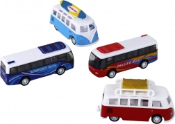 Le coffret contient 2 camping-cars (rouge et bleu) et 2 bus (bleu « Airport Bus » et rouge « Deluxe Bus ») complétés par des panneaux de signalisation. Une fabrication durable et des détails réalistes (fenêtres, sièges, porte-bagages de toit ou surf) font de ce set un cadeau parfait pour les petits passionnés de véhicules.