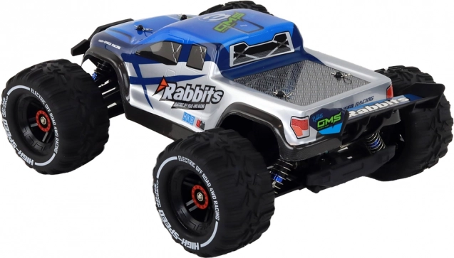 Voiture RC tout-terrain RABBITS 4x4 en version bleue offrant une transmission intégrale performante, une suspension robuste et de grands pneus à haute adhérence pour s'amuser hors route comme sur l'asphalte. Grâce au contrôle 2.4G réactif, à l'éclairage LED et à la batterie 1400 mAh, profitez de longues sessions de conduite avec une direction fluide et une excellente stabilité.