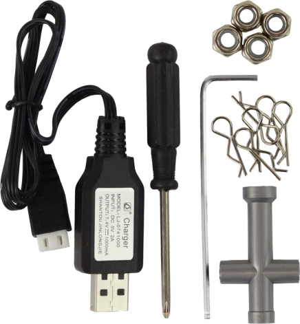 Grâce aux feux LED, le modèle reste attractif même lors des sorties du soir. La batterie 1400 mAh offre 12 à 16 minutes de conduite par charge et se recharge facilement avec le chargeur USB inclus. La télécommande, avec une portée jusqu’à 60 mètres, utilise des piles AA standard.