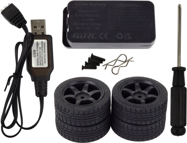 Conduite confortable avec volant et gâchette d’accélérateur, transmission stable sans interférences et accessoires pratiques: chargeur USB, batterie Li‑ion, pneus de rechange et outillage.