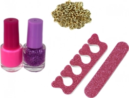 Deux vernis à ongles aux couleurs éclatantes, un séparateur d’orteils et une lime créent un mini salon pour les petites coquettes. Décoration des ongles facile et amusante à tout moment.