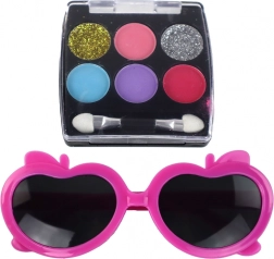 - 2× rouge à lèvres (rouge), palette de fards à paupières (rose, violet, bleu, pailleté argenté et doré), 2× palette de contouring, lunettes pour enfants roses en forme de cœur, pinceaux de maquillage, séparateur d’orteils, lime à ongles, 2× vernis à ongles, étui donut en plastique avec chaîne