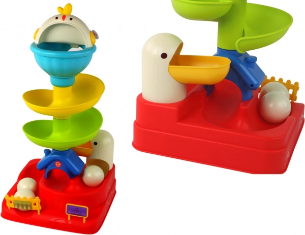 La partie supérieure avec poussin encourage les enfants à rejouer encore et encore. Les sons stimulent la perception et maintiennent l’attention pendant la descente des billes.