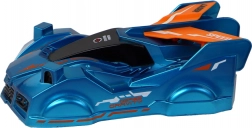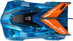 La voiture bleue aux lignes acérées et aux décors « LASER » et « SPEED » se distingue par sa vitesse et sa résistance.