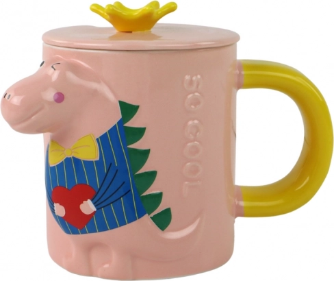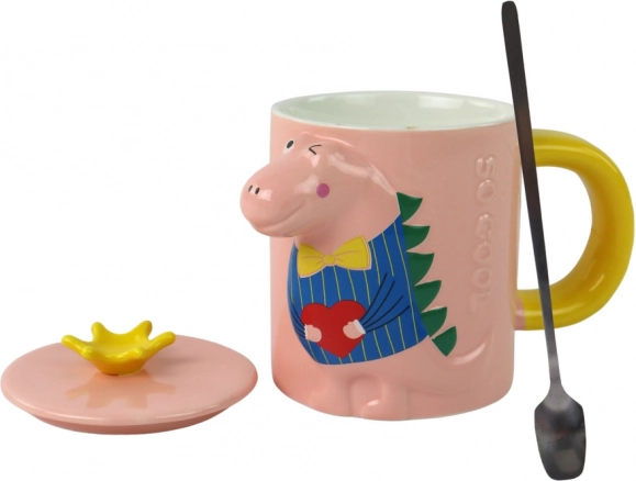 Ce mug en céramique stylé allie fonctionnalité et design ludique. Le corps rose avec anse jaune est complété par un couvercle surmonté d’une couronne jaune, qui protège la boisson et parachève son look original. Le motif dinosaure 3D en relief apporte de la joie à chaque gorgée – idéal pour café, thé ou cacao.