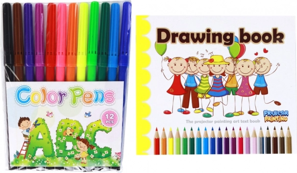 Le coffret comprend un équipement artistique complet : 12 feutres de couleur, un cahier de dessin et un chiffon. Le projecteur est alimenté par 3× piles AA 1,5 V (non fournies). Le jouet favorise la motricité fine, la concentration et le développement de l’imagination.