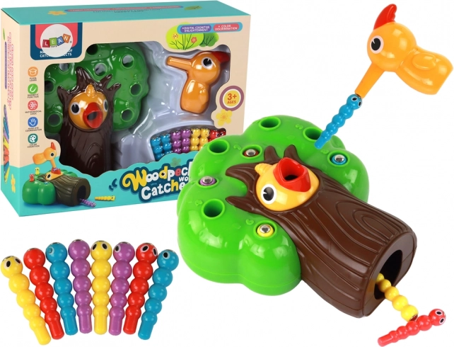Le coffret comprend un arbre percé de trous, un oiseau magnétique pour extraire les vers, des vers colorés et un oisillon/nid pour le « nourrissage ».