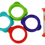 Le set comprend des anneaux en quatre couleurs et un sablier pour des manches rapides. Réglez le temps et essayez d’enfiler le plus d’anneaux possible avant que le sable ne s’écoule.