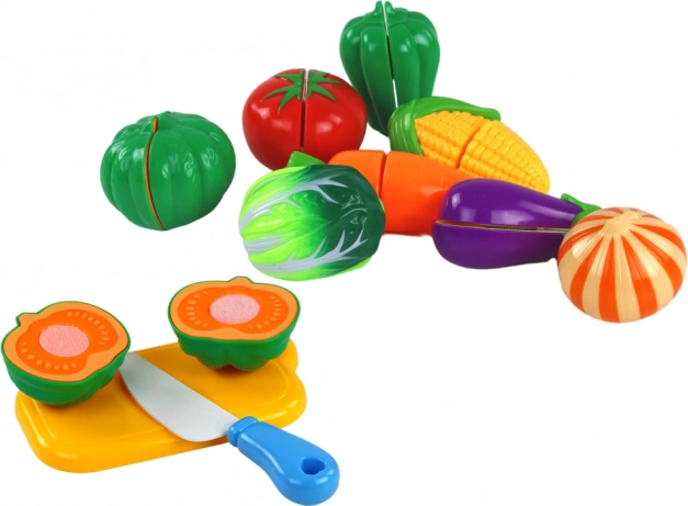 Chaque légume est divisé en deux moitiés reliées par un scratch. Les enfants peuvent « couper » encore et encore avec le couteau en plastique, développant ainsi leur motricité fine et leur patience.