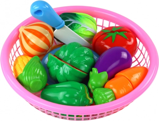 La boîte contient 8 types de légumes, un couteau en plastique et une assiette – tout ce dont les enfants ont besoin pour imiter les activités de cuisine et servir de « petits plats ».