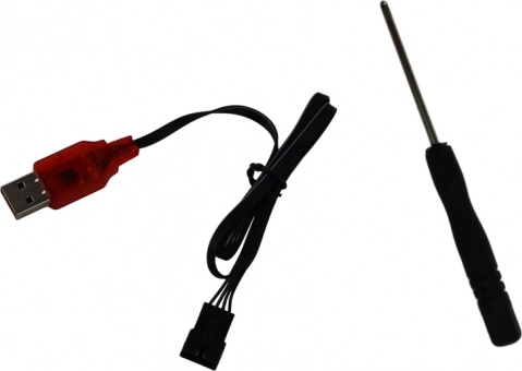 La boîte contient tout le nécessaire pour un départ immédiat : modèle avec accu 7,4 V 500 mAh, chargeur USB, émetteur et autocollants pour personnalisation. Il suffit d’ajouter 2× piles AA pour la radiocommande.